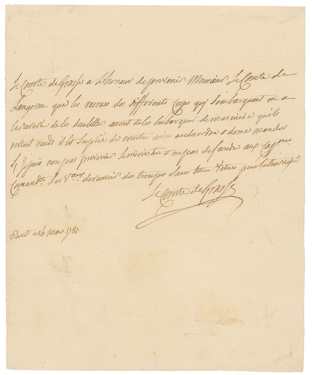French admiral (1722–1788) best known for his command of the French fleet at the Battle of the Chesapeake, which led directly to the British surrender at Yorktown. ALS in French, signed “Le Comte de Grasse,” one page, 7.25 x 9, March 14, 1781. Third-person ALS to the Count de Langeron. In full (translated): “The Count de Grasse has the honor to advise the Count de Langeron that the recruits to the different Corps when embarking suffer the hardship of being undressed before embarking so that they disembark naked. The Count is begged to put order into disorder and to advise de Grasse if he may advise the Minister and to forbid the ships’ captains to take aboard troops without clothes for the crossing.” In fine condition.