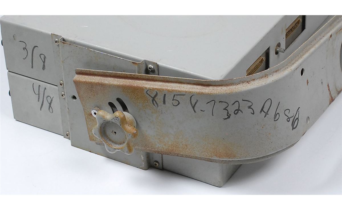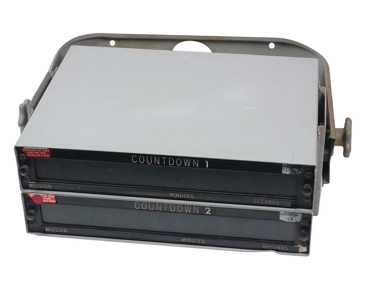 NASA Apollo-era countdown clock measuring 19 x 18.5 x 7.25. This digital countdown clock is a stack of two separate digital readouts, the first of which is labeled "Countdown 1" with display panels for mission, minutes, and seconds; and the second readout, labeled "Countdown 2" with displays for hours, minutes, and seconds. A partial label on front reads: "Property of USAF PAN/AM/ASD 08(606)-68C-0040." Handwritten on the side in black marker is: "8158-7323,” and “3/8 4/8.” There are six pin-type connectors on the rear that would connect to communication cables. In fine overall condition, with expected wear, and a small crack to top display. This clock is from the period, but not specifically associated with the Apollo program.