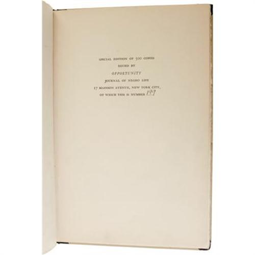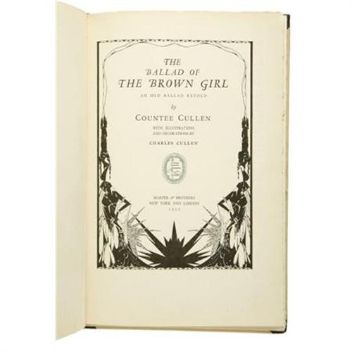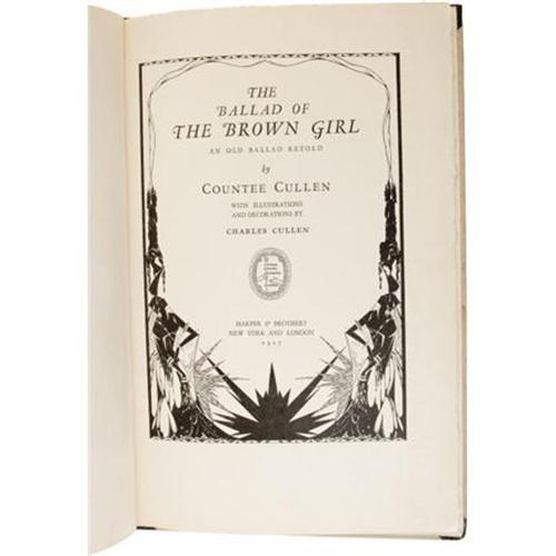 <B>Countee Cullen Signed Limited:</B></I><I> The Ballad of the Brown Girl An Old Ballad Retold.</B></I> (New York: Harper & Brothers, 1927), special edition of 500 copies issued by Opportunity Journal of Negro Life, this copy number 199, signed by the author on the ffep, unpaginated, illustrated by Charles Cullen, tan boards and black cloth shelf back and corners, paper spine label with black titles, printed on French velum, 8vo (6.5" x 9.75"), minimal soiling to covers, pages slightly toned, else near fine.<BR><BR><b>Shipping:</b> Flat Material, Small (<a target="_blank" href="http://www.heritageauctions.com/common/shipping.php">view shipping information</a>)