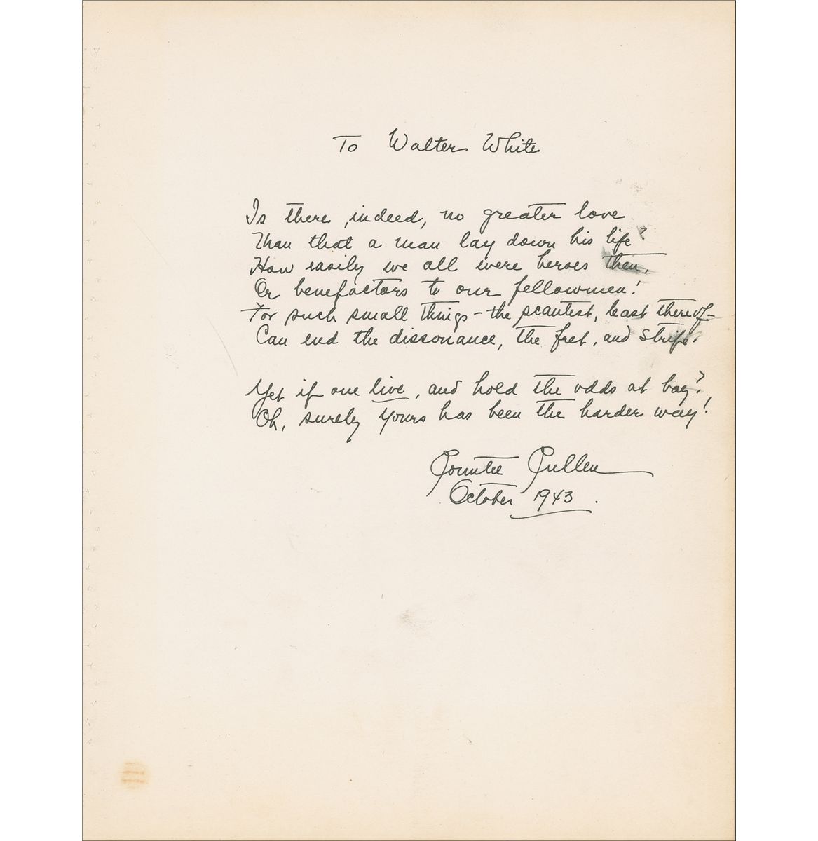 African-American poet (1903–1946) who came to prominence during the Harlem Renaissance. Handwritten poem on a beige 8.5 x 11 sheet. Cullen writes a poem, “To Walter White,” in full: "Is there, indeed, no greater love, Than that a man lay down his life? How easily we all were heroes then. Or benefactors to our fellowmen! For such small things—the scantest, least thereof, Can end the dissonance, the fret, and strife? Yet if we live, and hold the odds at bay? Oh, surely yours has been the harder way!" In fine condition, with light toning and mounting remnants to the reverse of the top right corner, and marginal binding holes to the left edge.