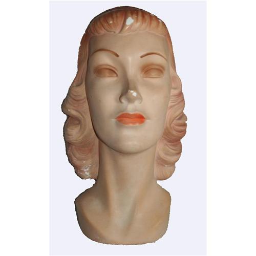 Lady's Head - Plaster, Light brown hair, orange lips, blank eyes, chip on nose and other minor chipping on hair. Approximately 14" T.