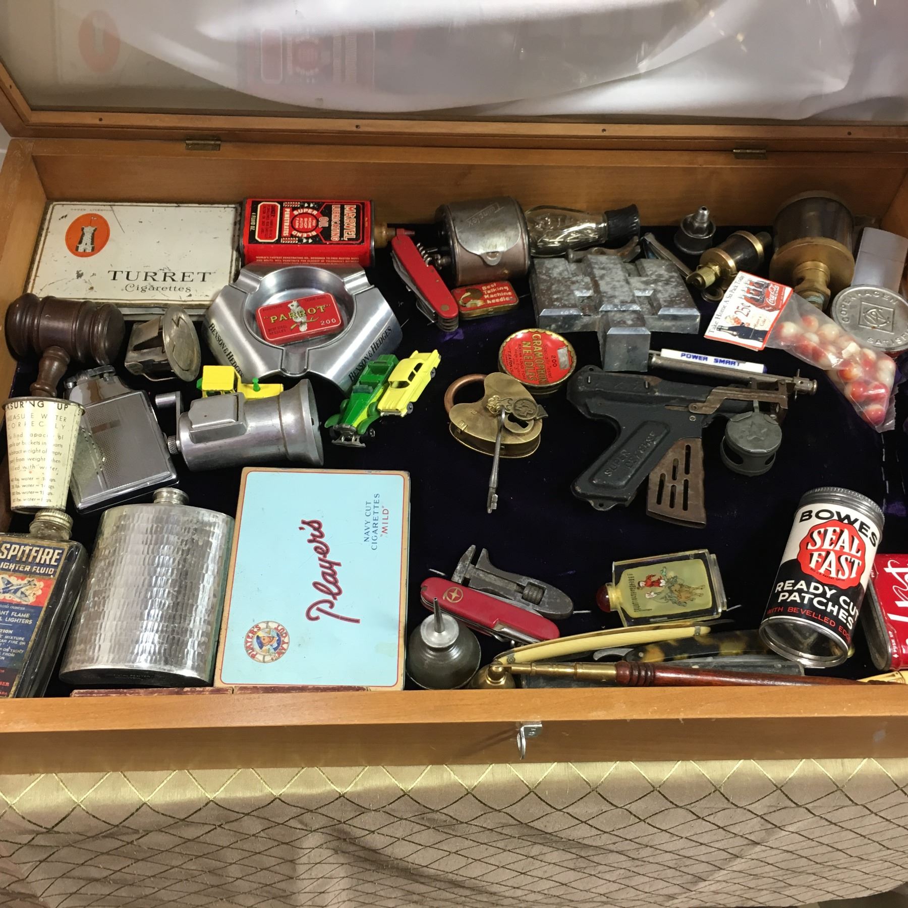 Counter Top Display Case w/Large Assortment of Small Collectibles (Incl: Gavel, Cig Tins, Lock & Key, Toy Gun, Tools, Oilers, Lighters, Razors & Much More !)