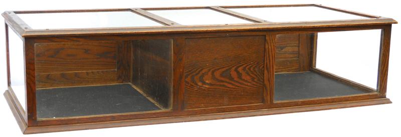 Counter display case, oak w/hinged doors at rear, center pull out display drwr w/cash drwr below, VG orig cond, 13"H x 52"W x 22"D.