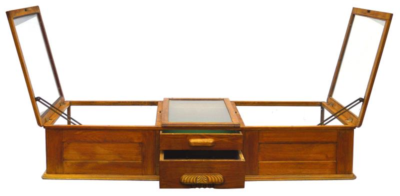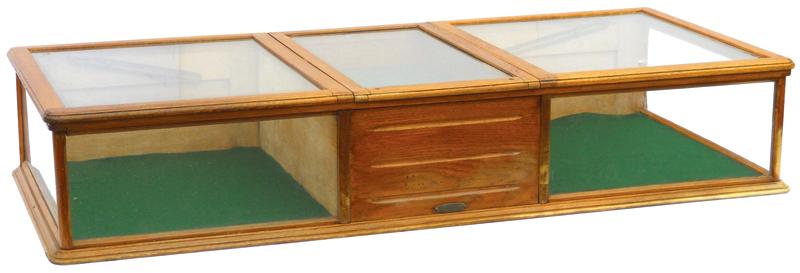 Counter display case, oak w/hinged top doors & orig metal maker's tag, mfgd by Waddel Wooden Ware Works, cash drwr at rear w/finger locks, Exc cond, 9.5"H x 52"W.