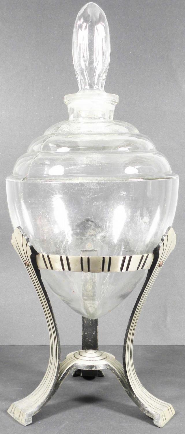 Counter top Apothecary Jar with original lid and aluminum stand. Excellent condition. 23 inches tall.
