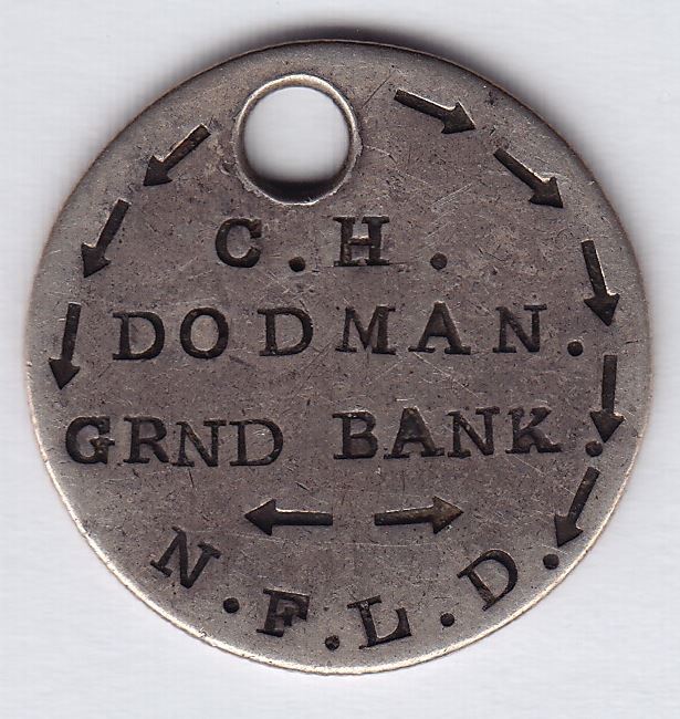 Countermarked Coin C.H. DODMAN. GRND BANK N.F.L.D. on obv. of U.S. Quarter, Unpublished. Holed. Ex Torex Auction, June 1989, lot 12.