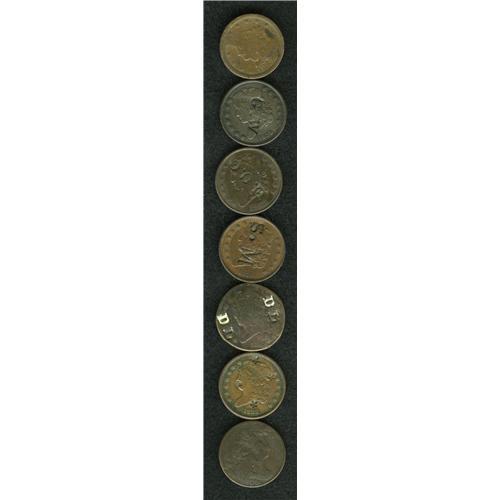 <B>Group Lot of Counterstamped U.S. Half Cents.</B></I> Seven different pieces counterstamped with various letters, one with stars. The counterstamped dates are 1806, 1832, 1833, 1835, 183x, and 1849. A perfect lot for the collector of counterstamped half cents. Viewing of this lot is recommended. Current market value is about $150-$250.