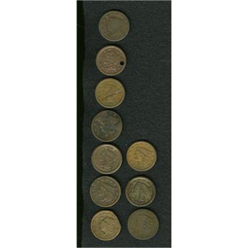 <B>Counterstamped Group Lot.</B></I> A lot of 10 counterstamped U.S. large cents dated from 1816 through the 1850s. All are counterstamped with either a name or a name and place. Some are attributed with catalog numbers. The current market value of this lot is $200+.<BR><BR><b>Shipping:</b> Coin/Currency (<a target="_blank" href="http://www.heritageauctions.com/common/shipping.php">view shipping information</a>)