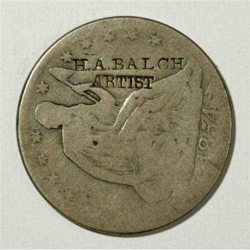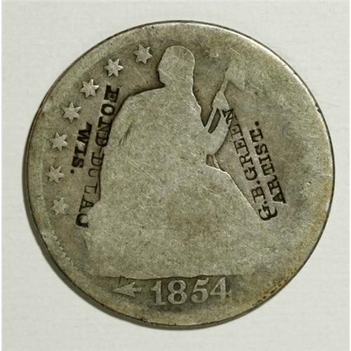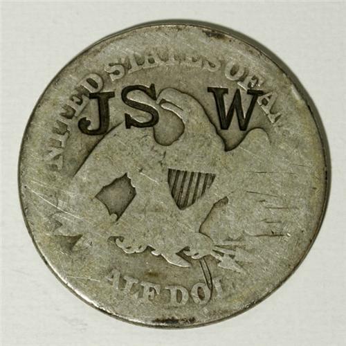 <B>Counterstamped Pair of Seated Half Dollars.</B></I> Two different counterstamps; an 1854-O Arrows counterstamped H.A. Balch Artist (Joliet, Illinois), Rulau-Ill-109A, likely a photographer's counterstamp; and a second piece counterstamped G.B. Green Artist Fond du Lac Wis., with an added counterstamp on the reverse, JSW. The current market value is approximately $250-$350.<BR><BR><b>Shipping:</b> Coins & Currency (<a target="_blank" href="http://www.heritageauctions.com/common/shipping.php">view shipping information</a>)