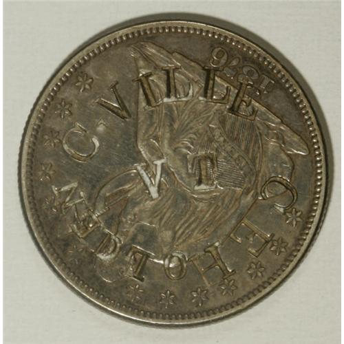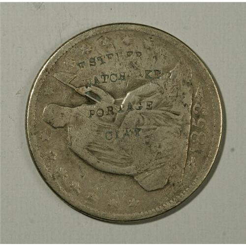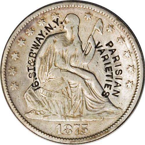 <B>Counterstamped Seated Liberty Half Dollar Group Lot.</B></I> Three half dollars: an 1853 Arrows and Rays counterstamped F. Steber Watchmaker Portage City, the letters are single punched; an 1876 counterstamped C.E. Holden C. Ville VT; and a scarce 1875 counterstamped Parisian Varieties 16 St. & B'way, N.Y., Rulau NY-NY-230, a well-known counterstamp. Parisian Varieties was an erotic show of nubile young women that opened Sept. 15, 1875, and ran until 1876. This fantastic lot is sure to draw the attention of serious collectors of counterstamp varieties. The market value is approximately $300-$400.<BR><BR><b>Shipping:</b> Coins & Currency (<a target="_blank" href="http://www.heritageauctions.com/common/shipping.php">view shipping information</a>)