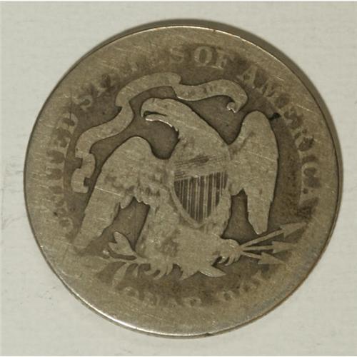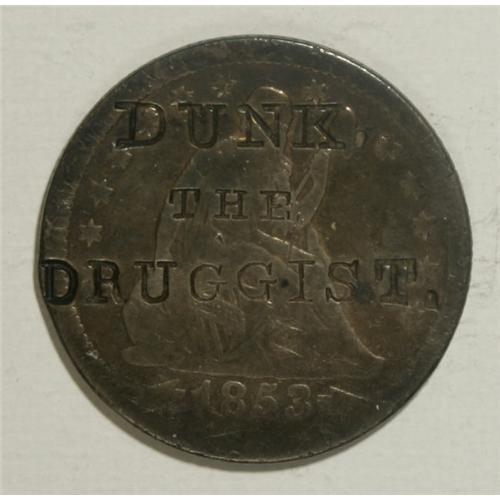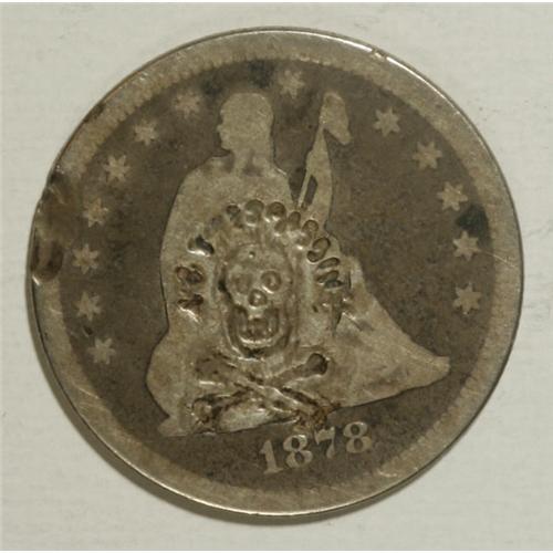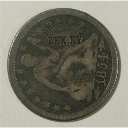 <B>Counterstamped Seated Liberty Quarter Group Lot.</B></I> Three counterstamped Seated Liberty quarters: an 1853 Arrows and Rays counterstamped DUNK THE DRUGGIST, Rulau Z10K; an 1854 Arrows counterstamped Shelton's Lex. Ky, Rulau Ky-Lx-38, the first reported on a Seated quarter; and the last and most interesting is an 1878 Seated quarter with the words NO TRESPASSING and a skull and crossbones counterstamped in the center. Some pieces in this lot may spur further research. Market value is about $175-$275.<BR><BR><b>Shipping:</b> Coins & Currency (<a target="_blank" href="http://www.heritageauctions.com/common/shipping.php">view shipping information</a>)