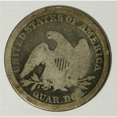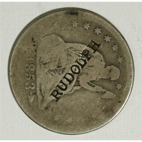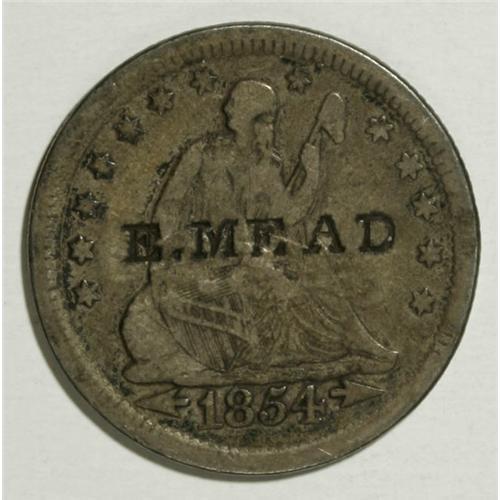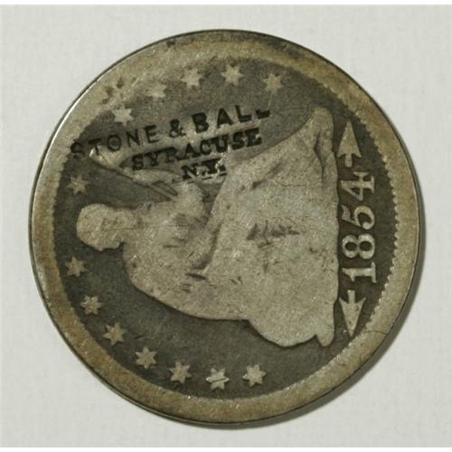 <B>Counterstamped Seated Liberty Quarter Group Lot of Known Merchants.</B></I> Three Seated Liberty quarters; an 1853 Arrows and Rays counterstamped Rudolph on the obverse, Rulau-Calif-119, Rudolph was a well-known druggist from Nevada City, California; an 1854 Arrows counterstamped Stone and Ball Syracuse, New York, Rulau-NY-1027D; and an 1854 Arrows counterstamped E. Mead, Rulau-MO-115b, Mead was a Missouri silversmith. The market value is about $375-$450.<BR><BR><b>Shipping:</b> Coins & Currency (<a target="_blank" href="http://www.heritageauctions.com/common/shipping.php">view shipping information</a>)