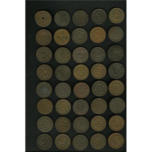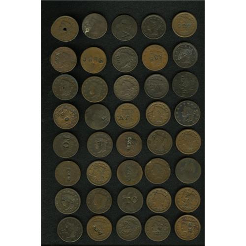 <B>Counterstamped U.S. Large Cent Group Lot, Uncertified.</B></I> An unattributed group lot of 40 miscellaneous counterstamped U.S. large cents dating from 1802 to the 1850s. A nice starter set for counterstamped large cent collectors. The current market value is approximately $350-$550.<BR><BR><b>Shipping:</b> Coin/Currency (<a target="_blank" href="http://www.heritageauctions.com/common/shipping.php">view shipping information</a>)