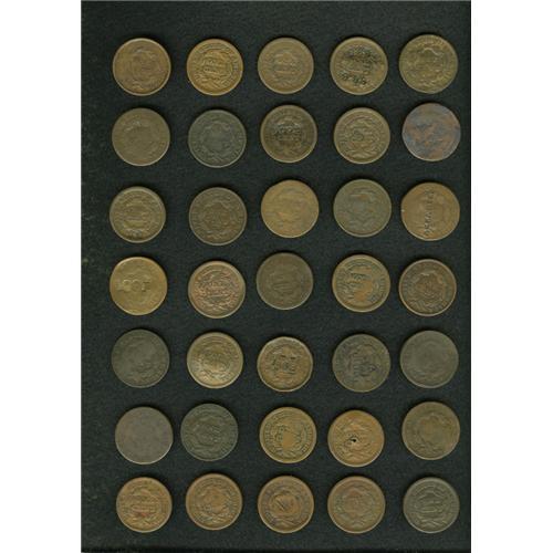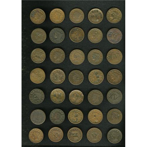 <B>Counterstamped U.S. Large Cent Lot, Uncertified.</B></I> Consists of 35 miscellaneous counterstamped large cents with various numbers or letters. A great dealer's lot or starter collection by date. Dates range from the early 1820s to the 1850s, with a current market value of approximately $150-$300.<BR><BR><b>Shipping:</b> Coin/Currency (<a target="_blank" href="http://www.heritageauctions.com/common/shipping.php">view shipping information</a>)