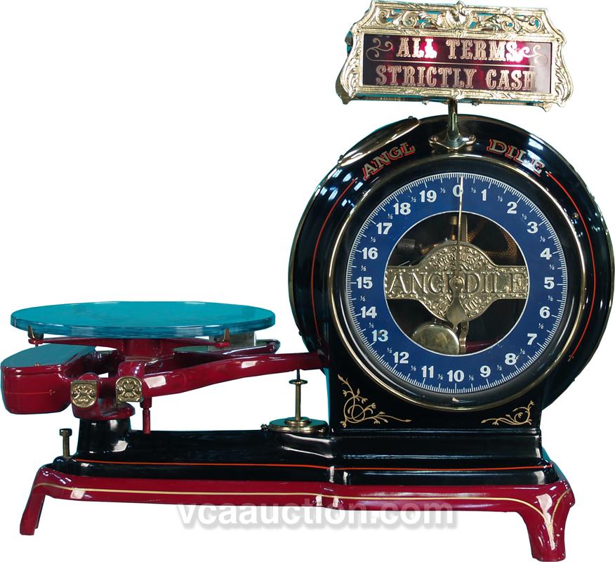 Countertop Angl-Dile Springless Scale w/ "All Terms - Strictly Cash" light-up top sign, nicely restored