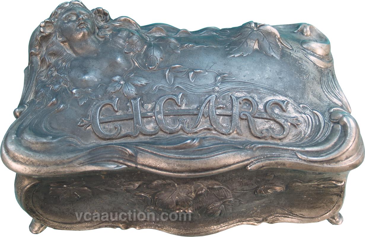 Countertop Embossed Metal Art Nouveau Cigar Humidor Box "Trademark JB Signifies The Best" stamped on bottom, topless lady figure on lid - 10" x 6" x 5" tall