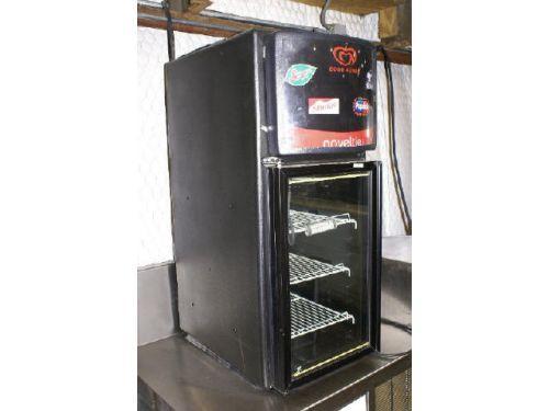 Black with black sides. Countertop Glass-door Freezer/Merchandizer for ice cream, etc.
