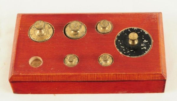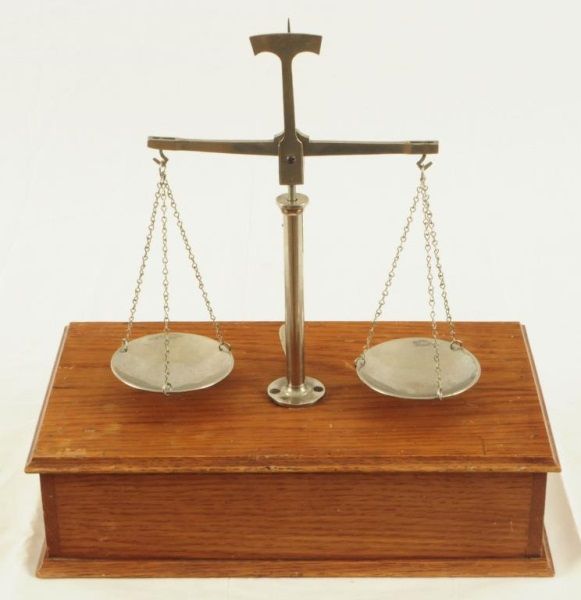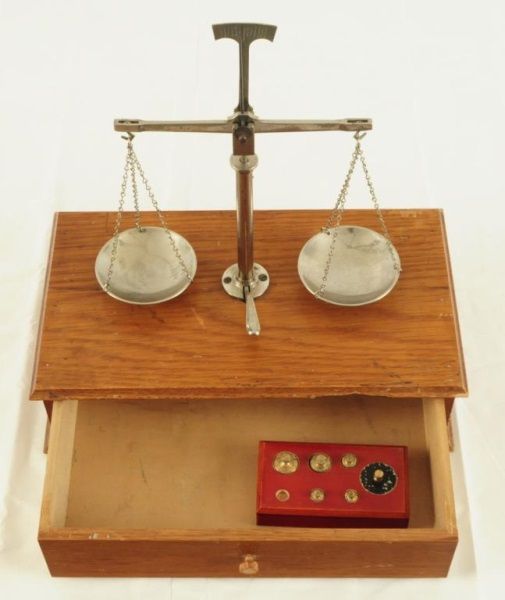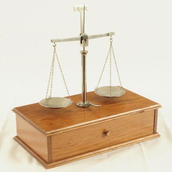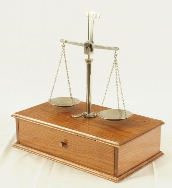 Balancing scale with 5 weights, single drawer. Measures 11 1/2" wide x 6 1/2" deep x 11" tall.
