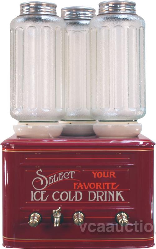 Countertop Triple Beverage Dispenser w/ 3 Ornate Glass Globes, Fully Restored, Handpainted Artwork "Select Your Favorite Ice Cold Drink", Red - 18" x 15" x 27" Tall