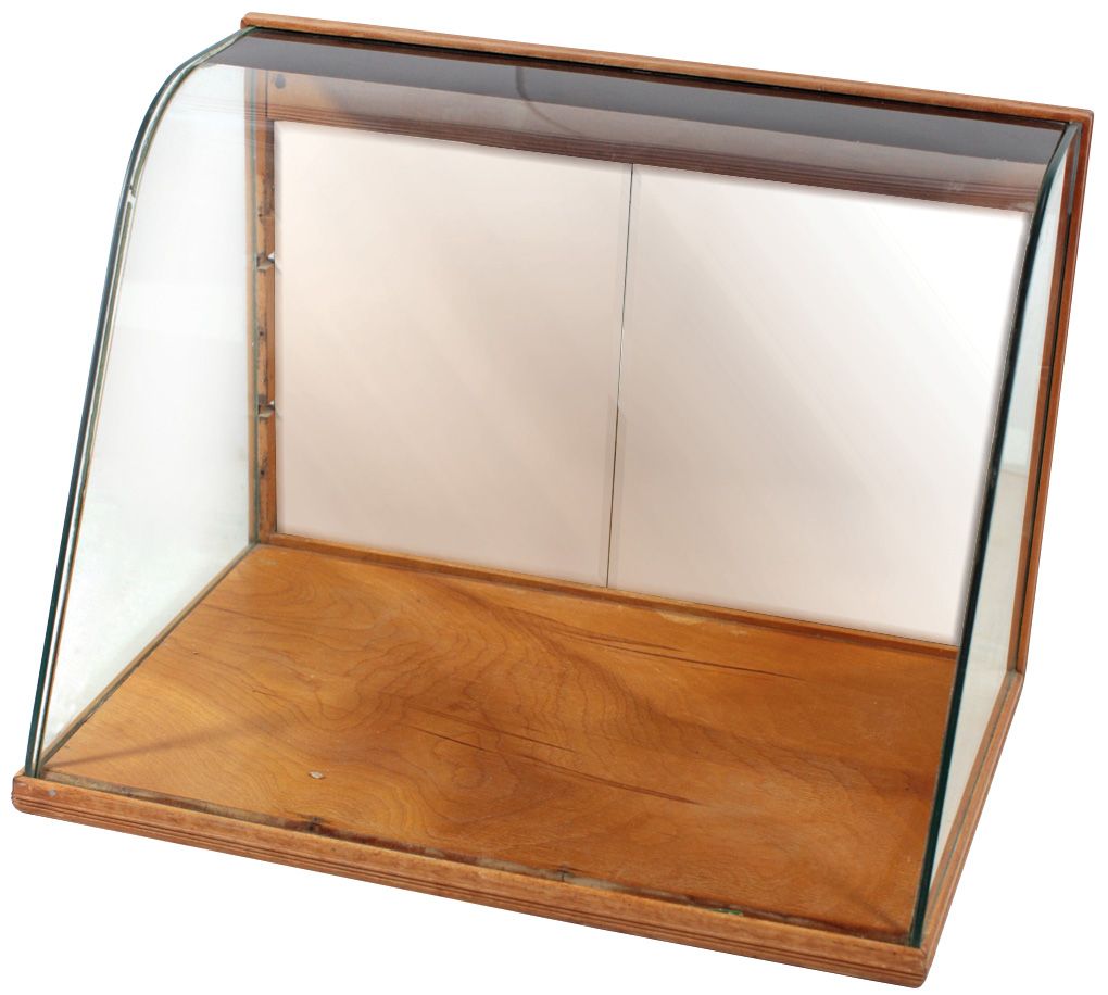 Countertop showcase, Art Deco style, maple w/curved glass front, mirror sliding back doors, made to hold 2 glass shelves, no shelves, o/wise Exc cond, 15"H x 20"W x 14"D.