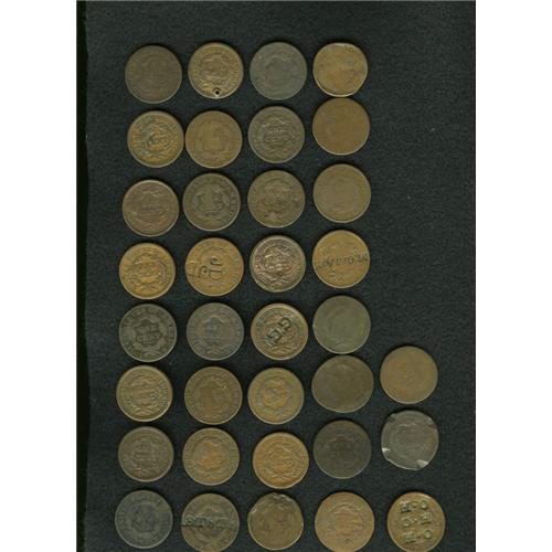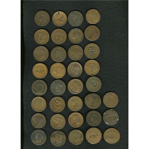 <B>Counterstamped United States Large Cent Group Lot, Uncertified.</B></I> An unattributed lot of 35 counterstamped U.S. large cents with single or multiple letters. A nice research lot, suited for the collector of counterstamped large cents. The current market value is approximately $150-$300.<BR><BR><b>Shipping:</b> Coin/Currency (<a target="_blank" href="http://www.heritageauctions.com/common/shipping.php">view shipping information</a>)