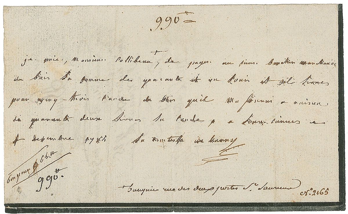 Infamous French courtesan (1743–1793) who was the last mistress of Louis XV. Accused of aiding emigres from the Revolution, she was imprisoned, tried, and executed during the Reign of Terror. ALS in French, signed “Le Comtesse du Barry,” one black-bordered page, 6 x 3.5, December 1786. Untranslated letter instructing her banker to pay an account from her lumber merchant. In fine condition, with vertical folds, a bit of mild toning, and some light show-through from docketing notations on reverse.