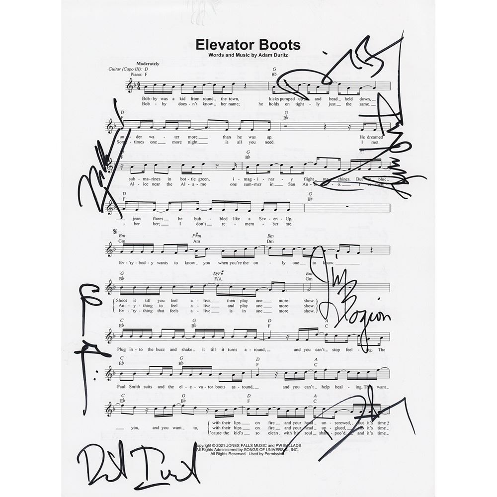 Souvenir sheet music for the song ‘Elevator Boots,’ the first single from the Counting Crows EP Butter Miracle, 9 x 12, signed in black felt tip by Adam Duritz, David Bryson, Charlie Gillingham, David Immerglück, Dan Vickrey, Jim Bogios, and Millard Powers. In fine condition, with a light bend to the upper border.