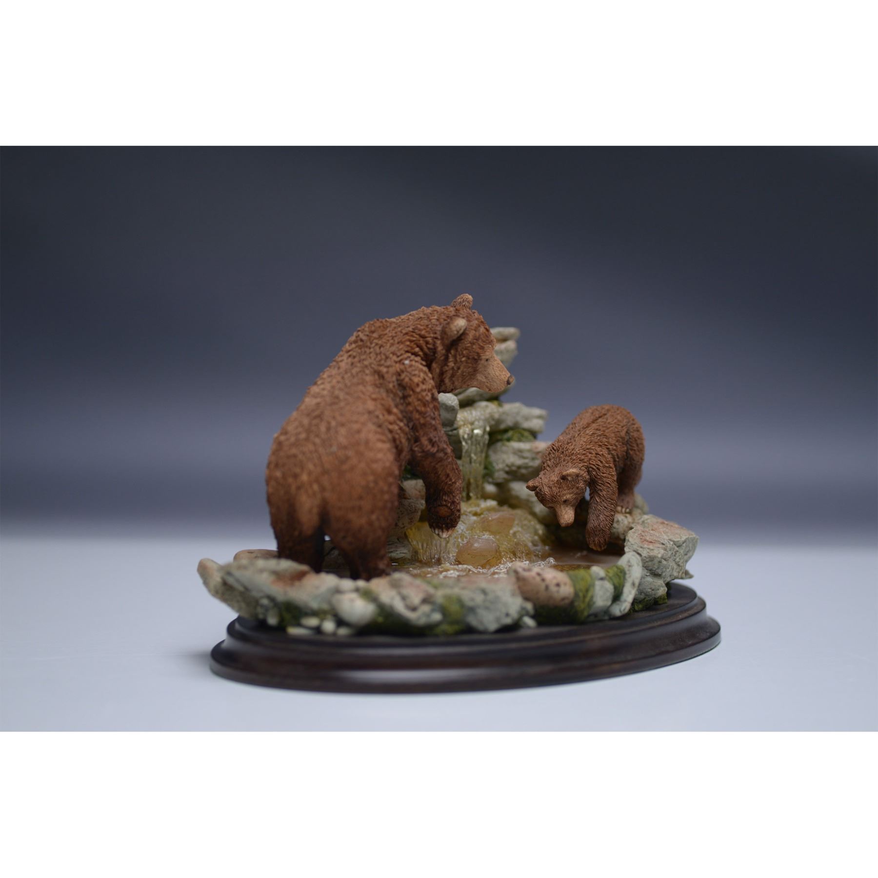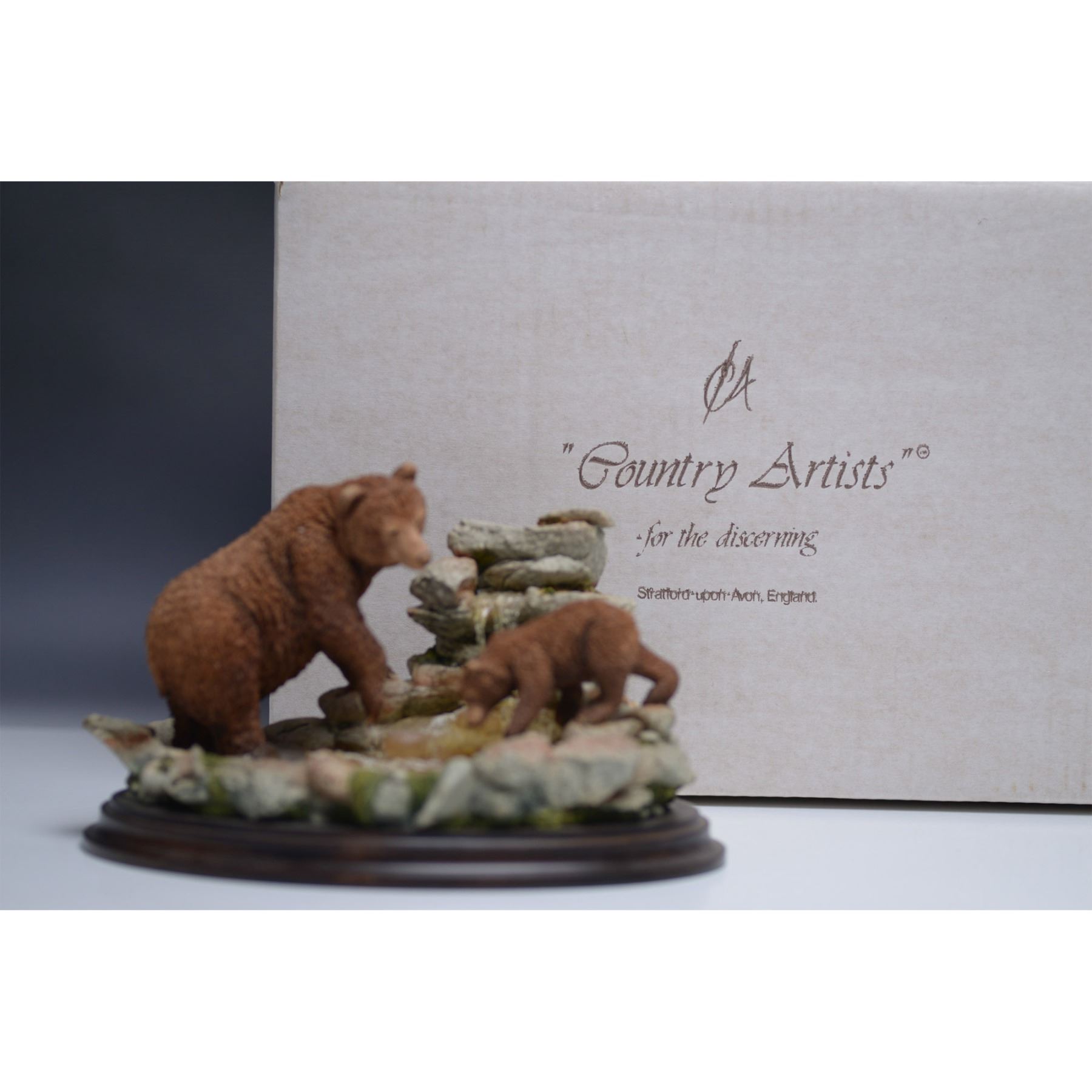 Country Artists "First Lesson" CA780 figurine, featuring a bear teaching its cub near a rocky stream. Handcrafted and painted in Stratford-upon-Avon, England, this piece is mounted on a wooden base. The figurine measures 5.25"H and comes with its original box, which measures 9.25"H x 13.25"L. A charming collectible showcasing the brand's attention to detail and craftsmanship.
