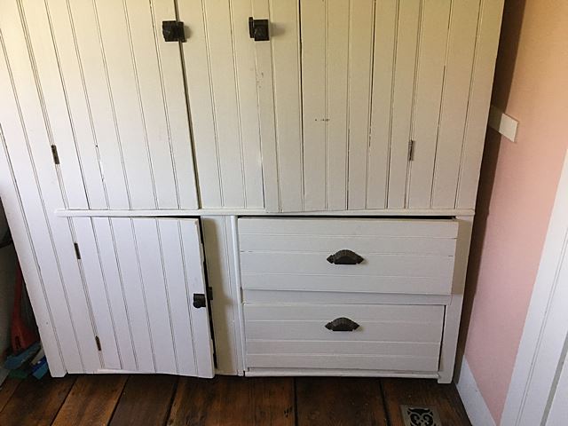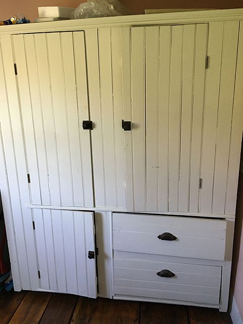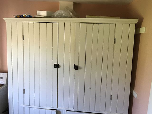 3 door, 2 drawer country cabinet measures approx. 63" wide x 75" tall x 18" deep. This lot is from a 100 year old Farm House in Sharon, CT, at the estate of Mr. John Morgan, a prominate Connecticut farmer, whose family has owned and farmed at this location for over 50 years. This lot can be picked up in Sharon CT for local buyers, or our shipper can pick up and ship to your location.