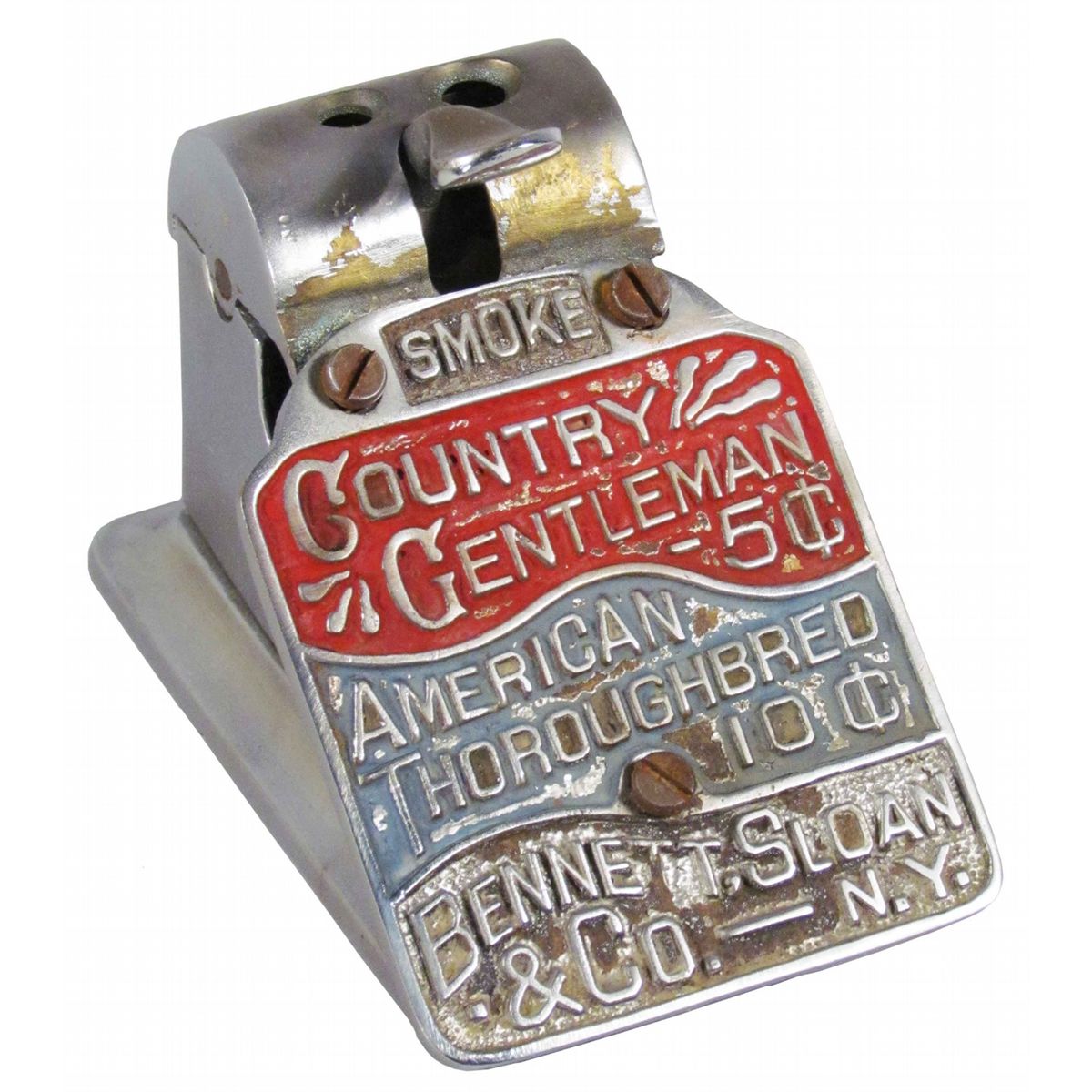 Country Gentleman 5 Cent American Thoroughbred 10 Cent Cigar Cutter. Bennett, Sloan & Co. NY. Excellent original condition. 3 X 3 1/2 X 4 1/2 inches.