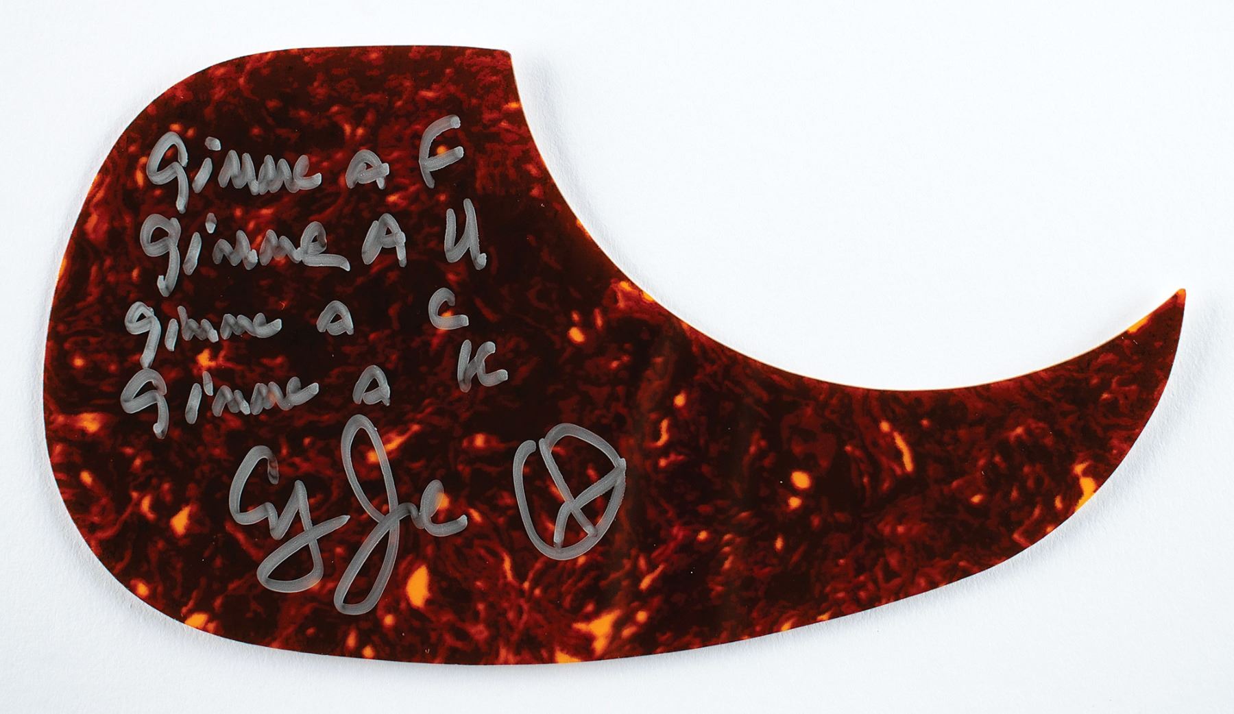 Acoustic guitar pickguard signed in silver ink by Country Joe McDonald, who adds a peace sign and his humorous "Gimme a F" chant from Woodstock. In fine condition.
