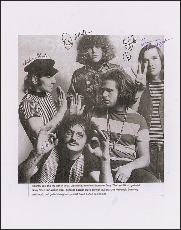 Interesting 8.5 x 11 book photo of the group, signed in ink and felt tip by all five original members: Gary Hirsch, Barry Melton, Bruce Barthol, Joe McDonald, and David Cohen. In fine condition.
