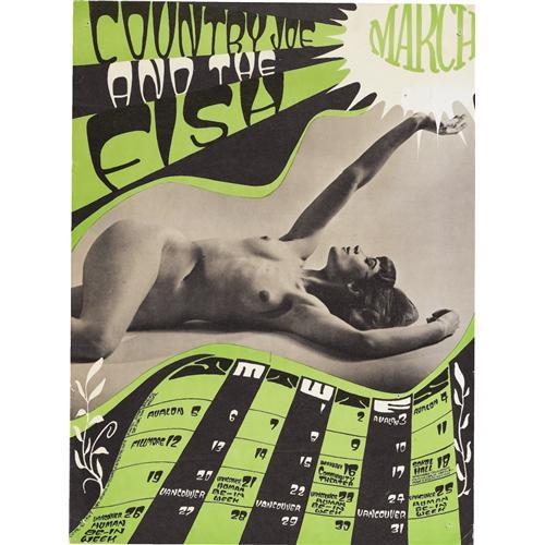 <B>Country Joe and the Fish March Calendar Concert Poster (Joyful Wisdom Enterprises, 1967).</B></I> This is one of a series of Country Joe and the Fish posters done as calendar pages, showing all the band's dates for the month of March 1967. To make it all a little sweeter, a "tasteful" nude portrait of a female model was incorporated into the design... not that we're complaining! The poster measures approximately 17" x 23", and is in VG- condition with numerous tackholes and light stains.<BR><BR><b>Shipping:</b> Flat Material, Large (<a target="_blank" href="http://www.heritageauctions.com/common/shipping.php">view shipping information</a>)