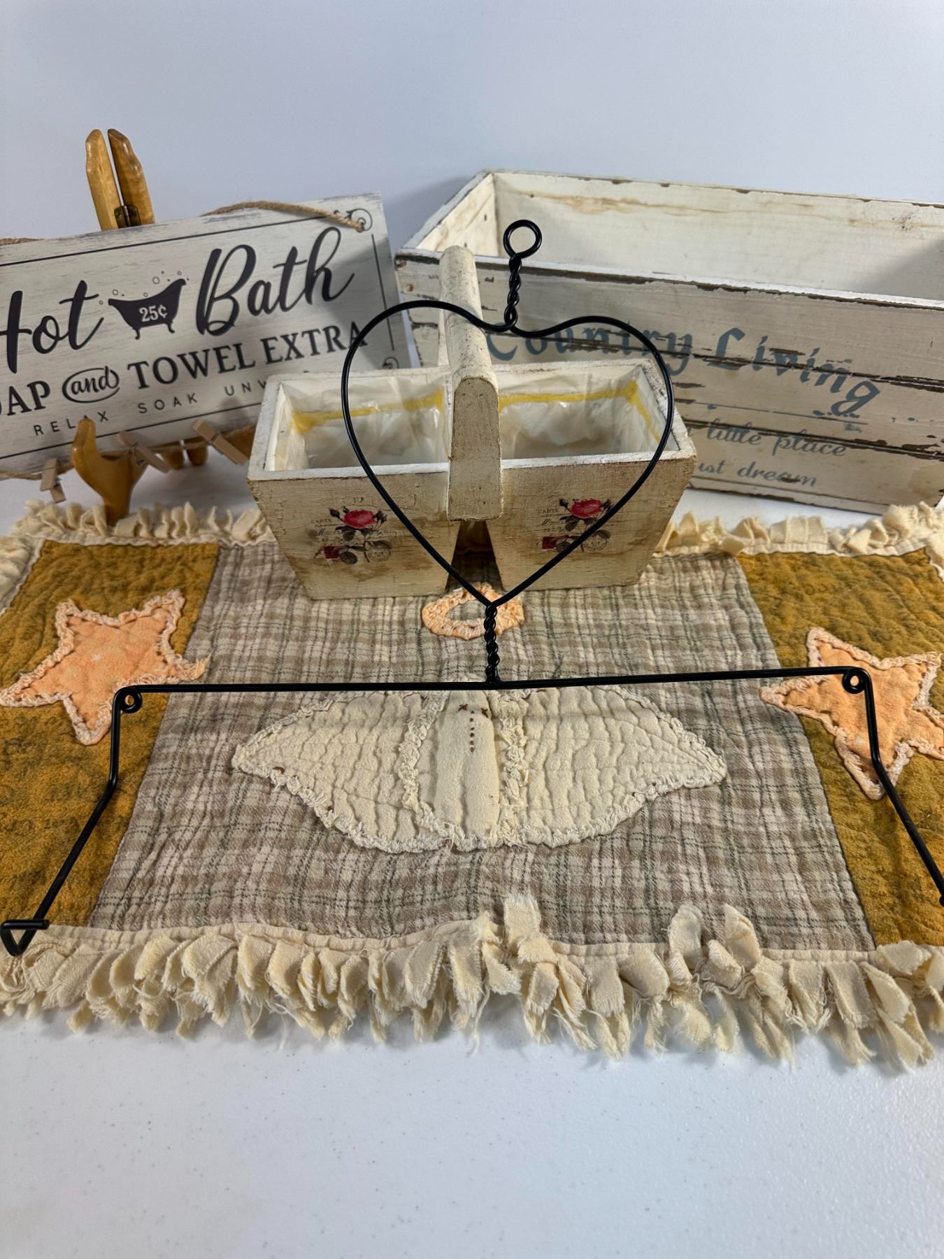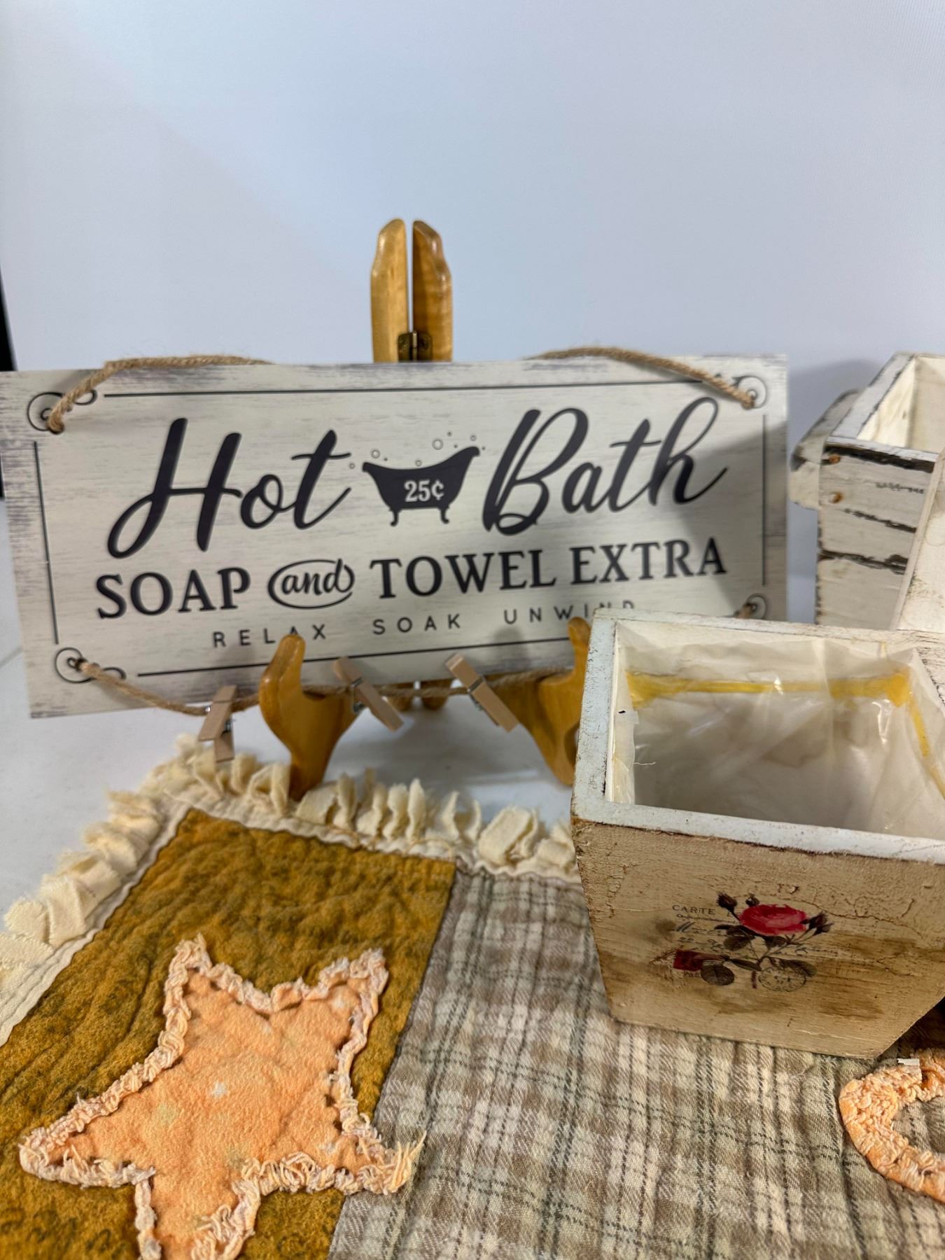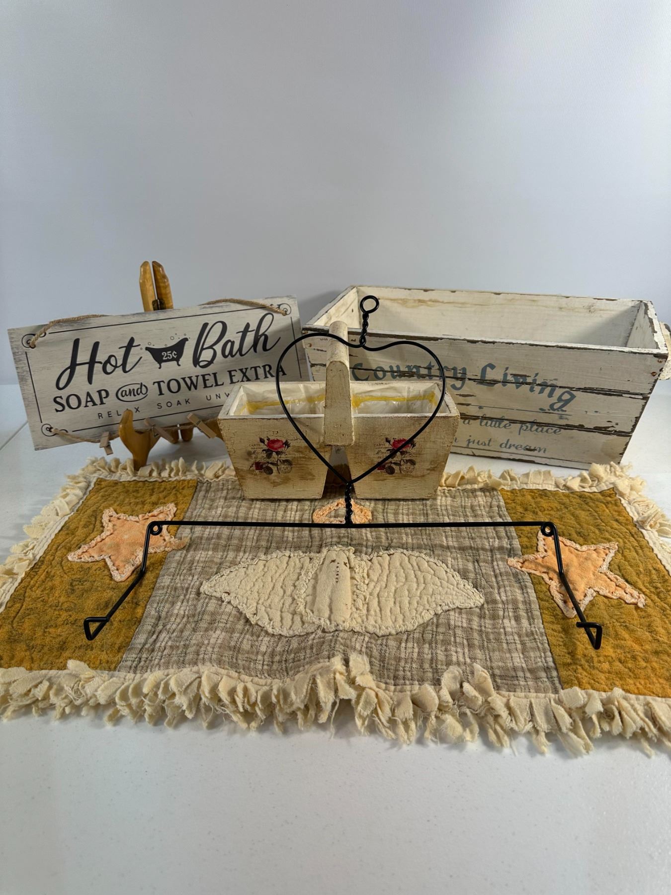 Charming farmhouse-style décor set featuring wooden Hot Bath and Country Living signs, a rustic caddy with heart handle, and a quilted table runner with appliqué stars. Warm, cozy country charm.