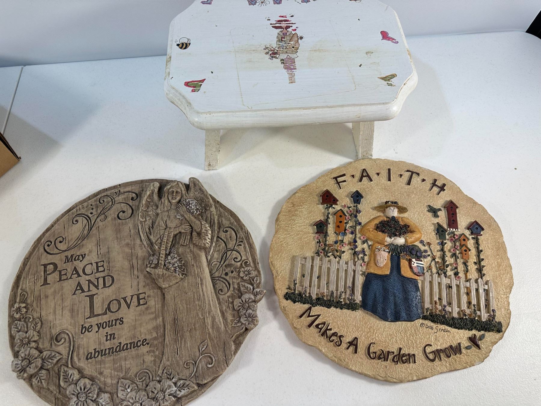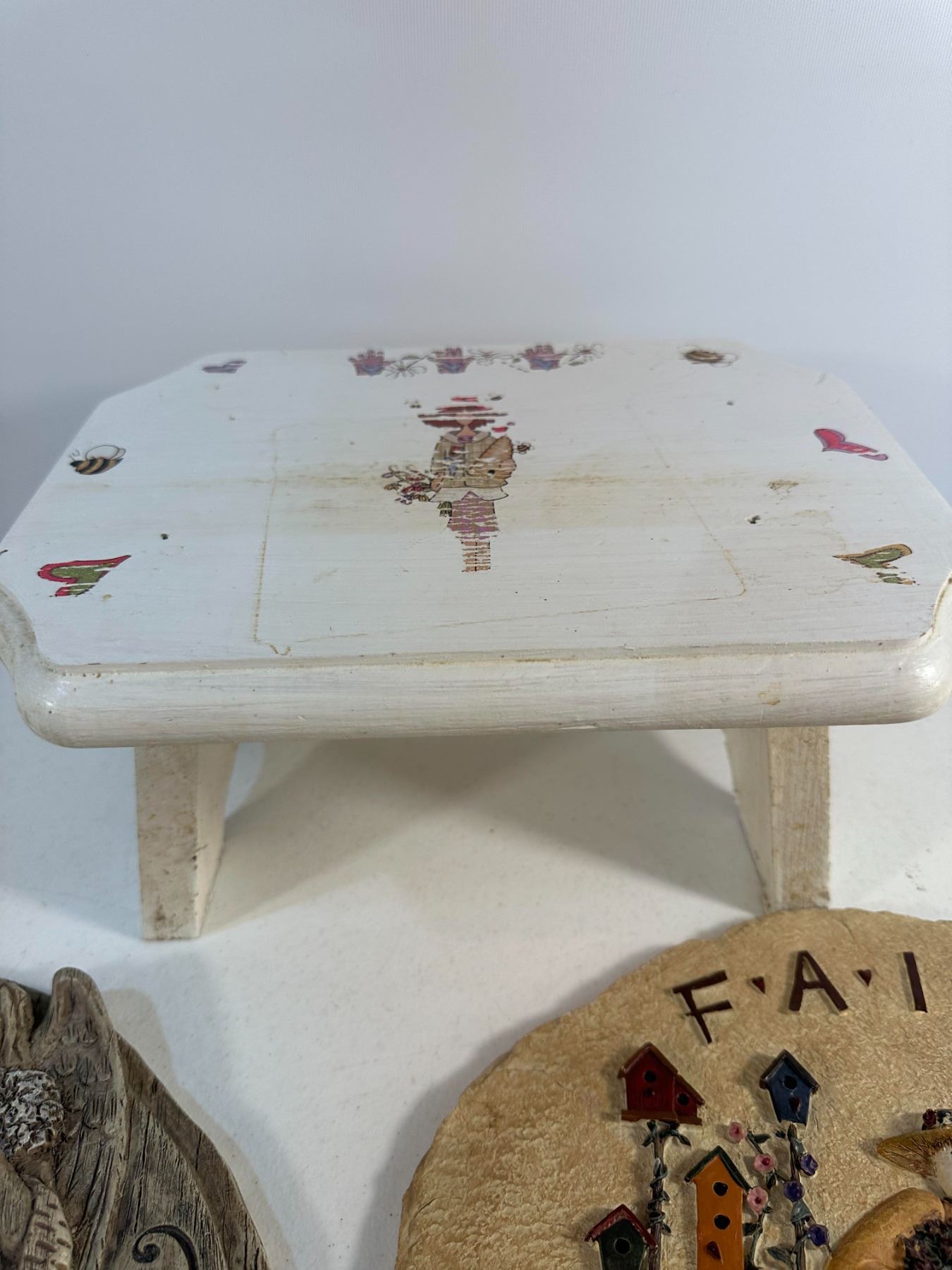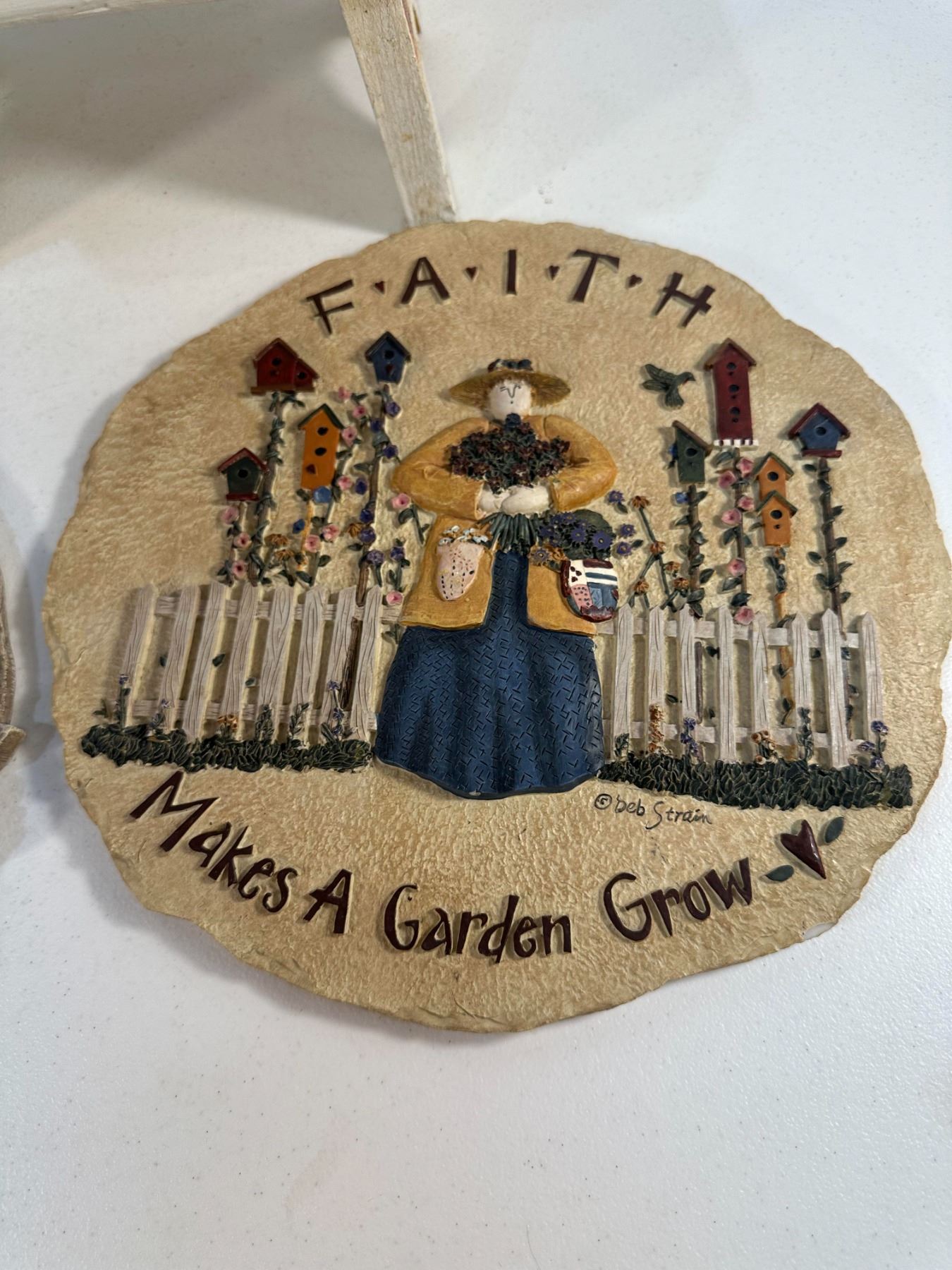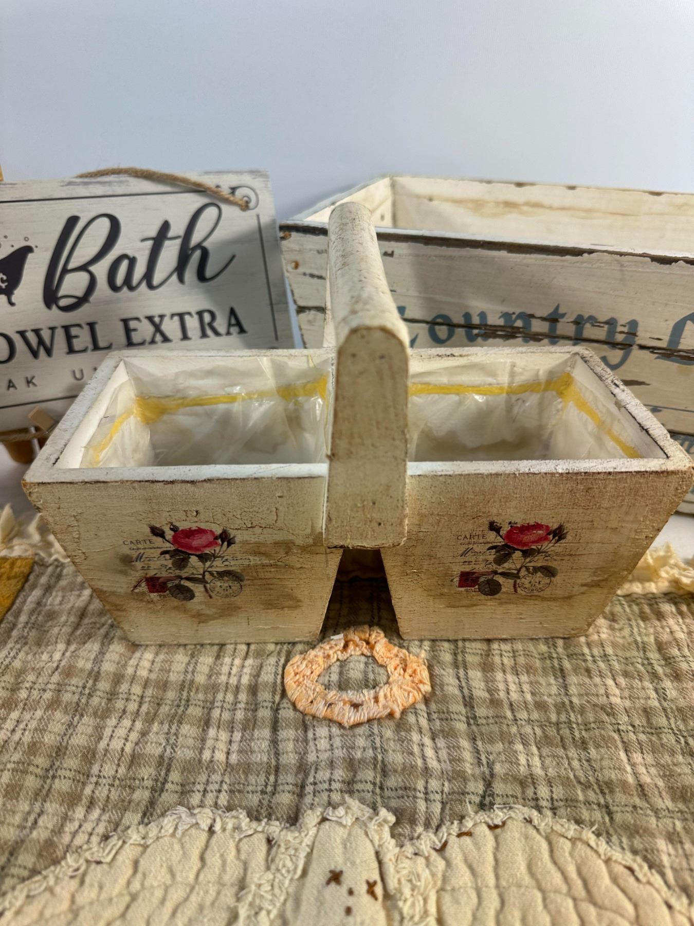 Charming farmhouse-style décor set featuring wooden Hot Bath and Country Living signs, a rustic caddy with heart handle, and a quilted table runner with appliqué stars. Warm, cozy country charm.