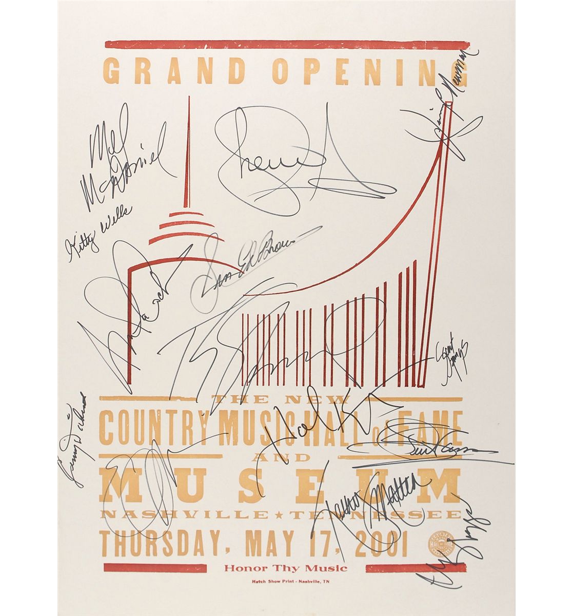 Color 17 x 23 poster celebrating the grand opening of the Country Music Hall of Fame in 2001, signed in black felt tip by 14 including Kitty Welles and Kathy Mattea. In fine condition.