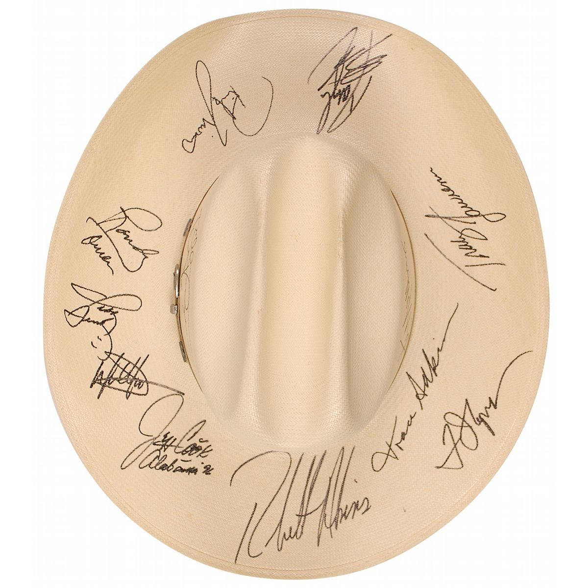 Off-white Resistol cowboy hat, size 7 1/8, signed in black felt tip by: all four members of Alabama, Mindy McCready, Lorrie Morgan, Mandy Barnett, Lori White, all five members of Lonestar, Linda Davis, Chely Wright, Rhett Akins, Billy Dean, Wade Hayes, Ken Mellons, Trace Adkins, Tracy Lawrence, Daryle Singletary, Rick Trevino, Aaron Tippin, and Lisa Brokop. In fine condition.