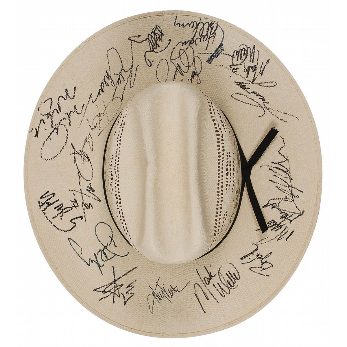 White cowboy hat, approximately 15-inch diameter, signed in-person in black felt tip by over 20 country music stars. Signers are: Tim McGraw, Martina McBride, Kenny Chesney, Toby Keith, Trace Adkins, Mindy McCready, Mark Wills, Bryan Smith, Clay Walker, Wade Hayes, Lorrie Morgan, the Bellamy Brothers, Ty England, Jo Dee Messina, Neal McCoy, David Lee Murphy, Aaron Tippin, Collin Raye, Gary Alaen, Mila Mason, Regina Regina, and David Kersh. In fine condition. Consignor notes that the hat was signed at the 1997 Fan Fair in Nashville.