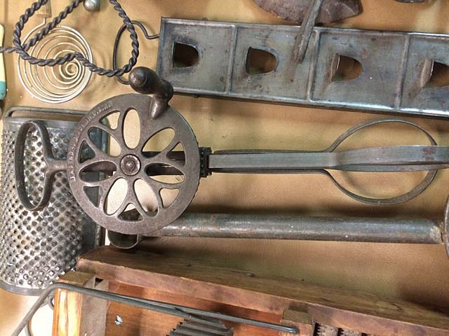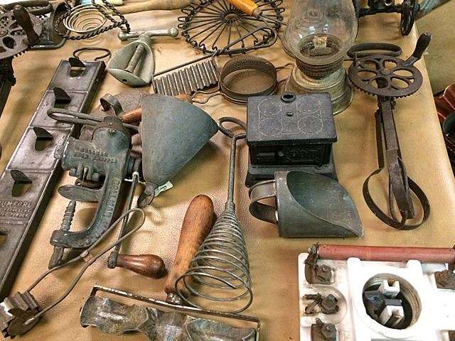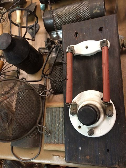 Country Primitives lot includes graters, strainers, mixers, vintage circuit breakers, kitchen utensils, oil lamp, alarm bell, etc., nice collection of country primitives right off the farm!