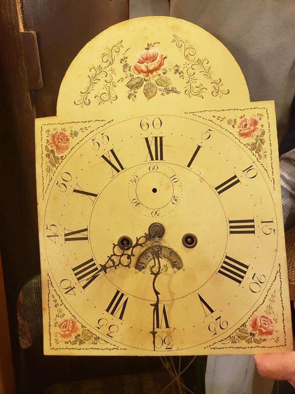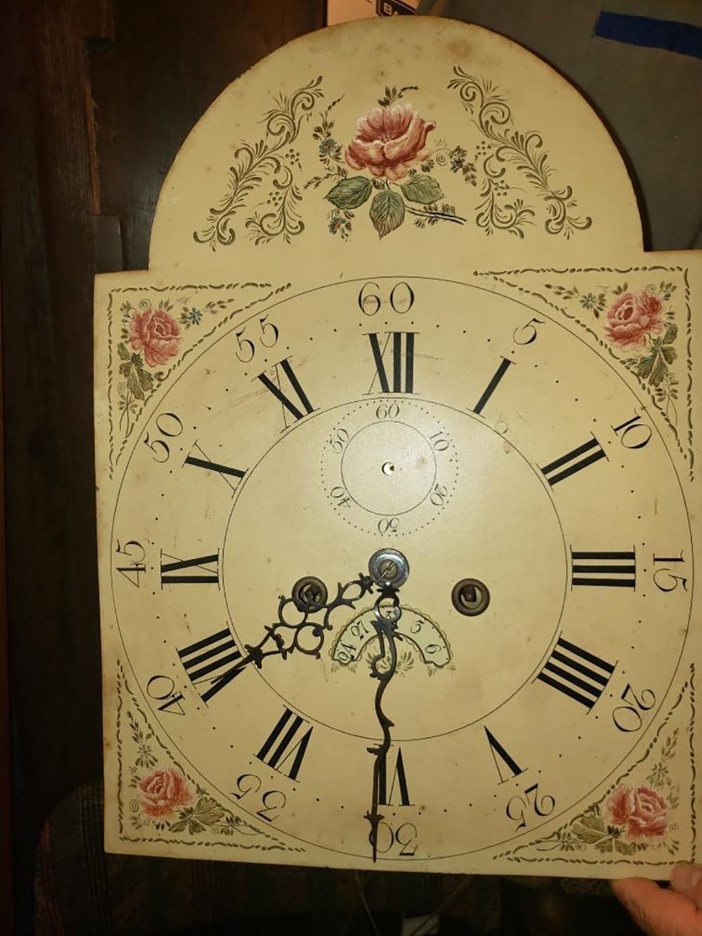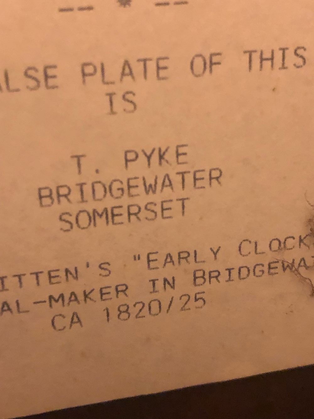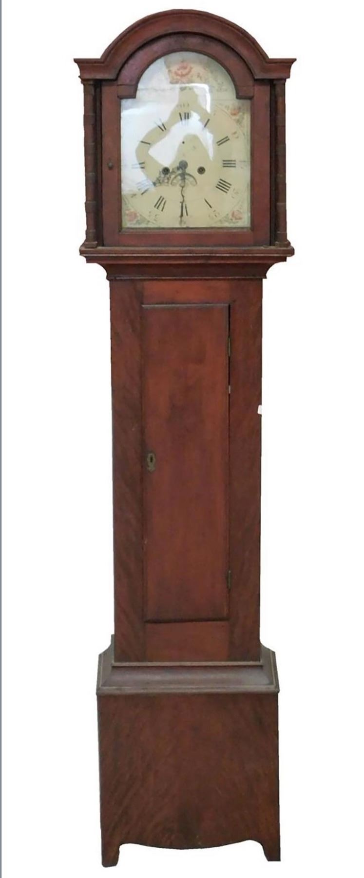 1820-25, English Movement, red stenciled case, all original, weight driven with pendulum and weights.T. Pyke Bridgewater Somerset.