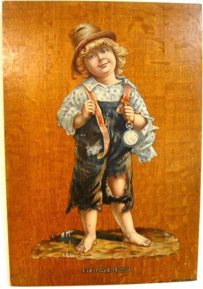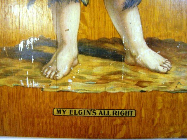 Country Store Advertising Elgin Pocket Watches "My Elgin's All Right" on Oak Panel. Measures 22 in. x 16 In. Made by The Meyercord Co., Chicago. Beautiful example of vintage "Americana" advertising.