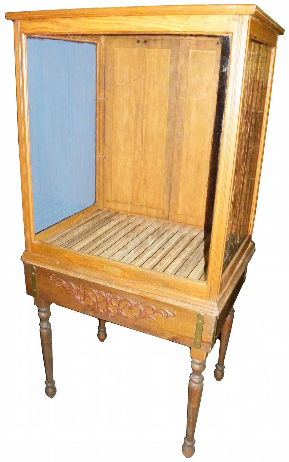 Country Store Bakery Display Cabinet on four legged base. Oak and glass with two glass shelves. Made by Columbus Show Case Co. Columbus, OH. Base may not be original to cabinet. Good condition. 32 X 65 X 24 inches.