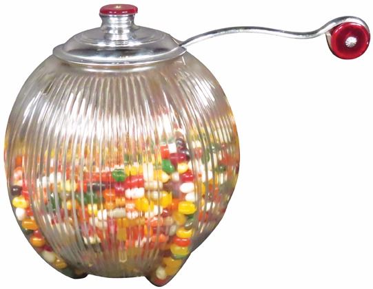 Country Store Candy Jar. Ribbed glass with original chrome lid with ruby celluloid knob and scoop handle. No chips or cracks. 10 1/2 inches tall X 8 inch diameter.