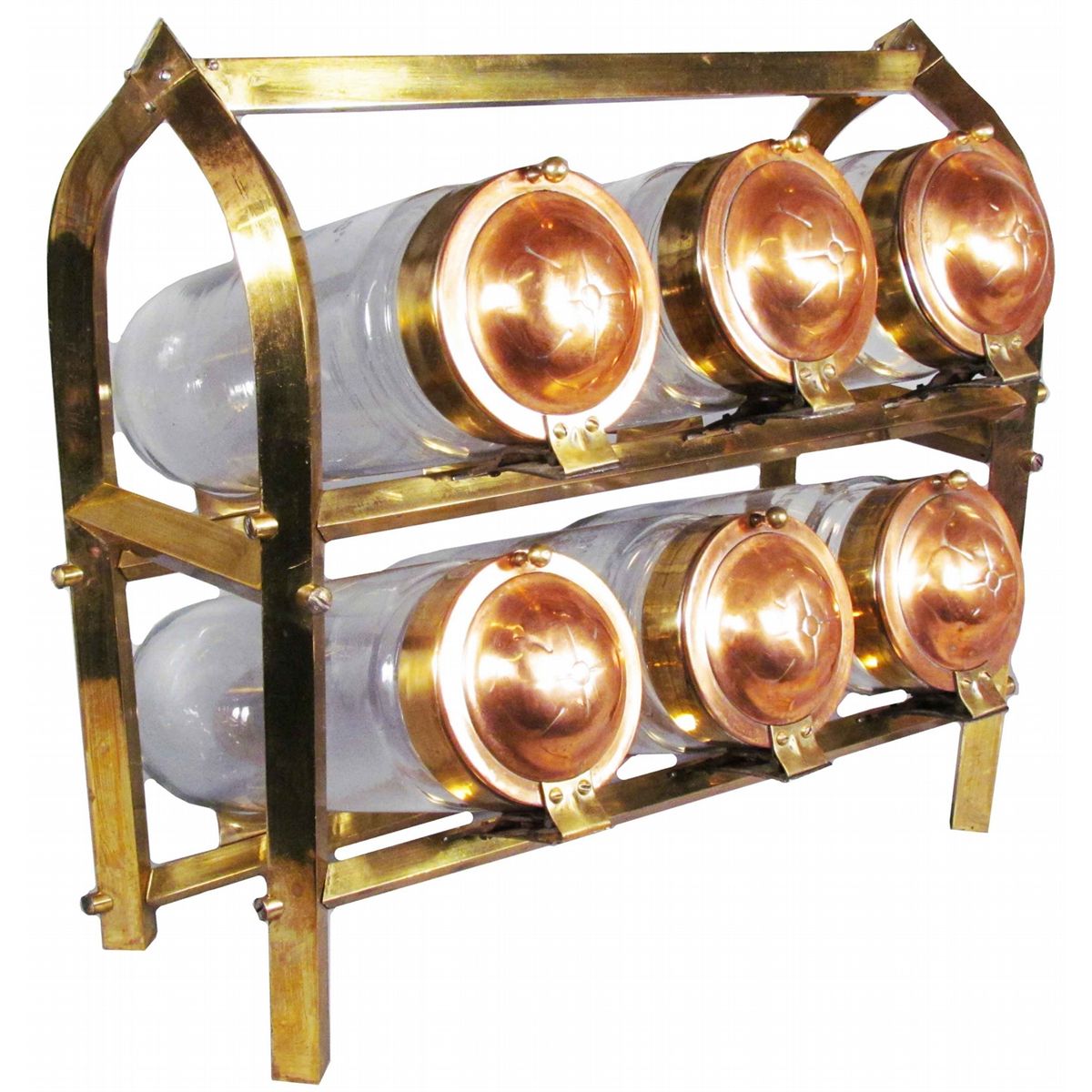 Country Store Candy Vendor by Vencosolo. 6 brass and copper lidded jars in original brass rack. Excellent condition. 23 X 21 X 16 inches.