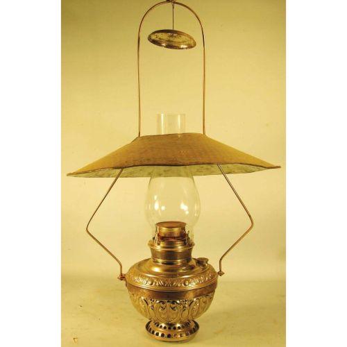 Country Store Ceiling Lamp number 3 Mfg. by Banner with nickel plated brass reservoir and tin shade. Excellent original condition. 34 inches tall X 20 inch diameter.