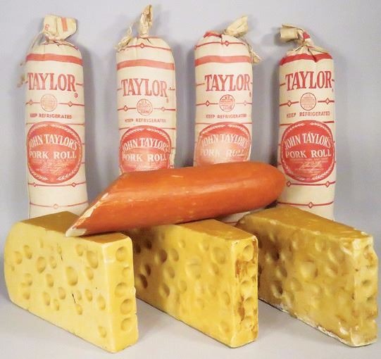 Country Store Display Food Items. (4) Taylor pork roll linen sacks. Faux meat roll and cheese wedges.