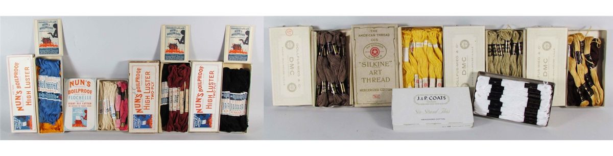 Country Store Millinery Items. 9 Boxes of Embroidery Floss including (4)Nun's Boilproof High Luster Thread, (3) Dollfus-Mieg & Co, J & P Coats and Silkine Art Thread. Each box contains product with original packaging.