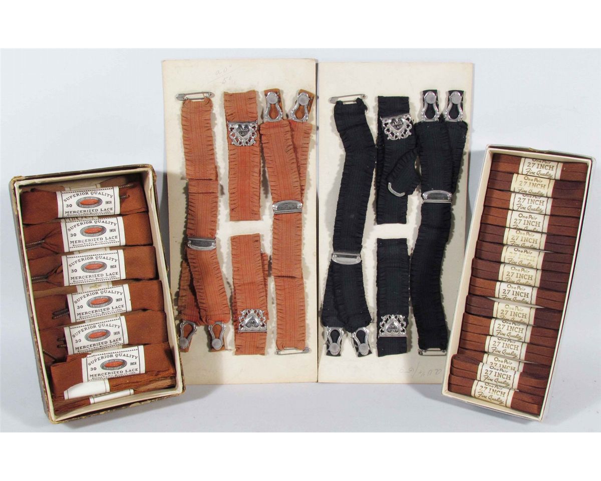 Country Store Millinery Items. Two pairs of "Magic Clasp" Garters on original store display cards. Dusty Rose and Black. Misc. shoe laces 27 and 30 inch brown.