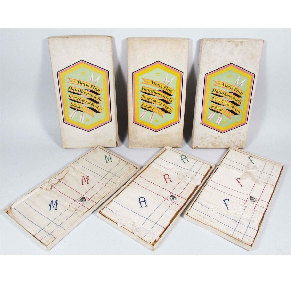 Country Store Millinery Items. Three complete boxes of Men's Initialed Handkerchiefs. M,R and F. Some age staining otherwise good condition. Boxes measure 5 1/4 X 1/2 X 10 1/4 inches.