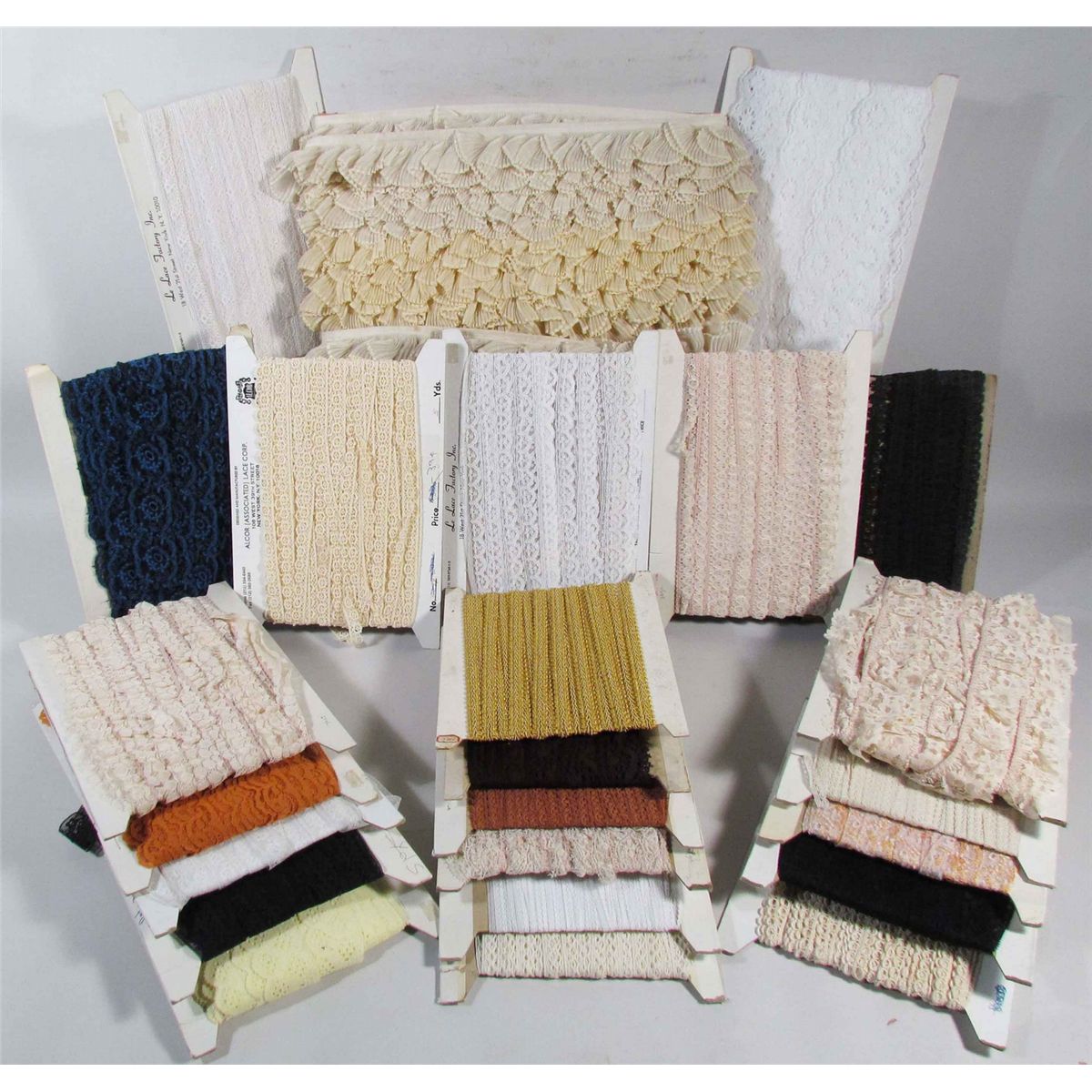 Country Store Millinery Items. 24 Various Cards of Lace Trim. Various colors, styles and yardage.